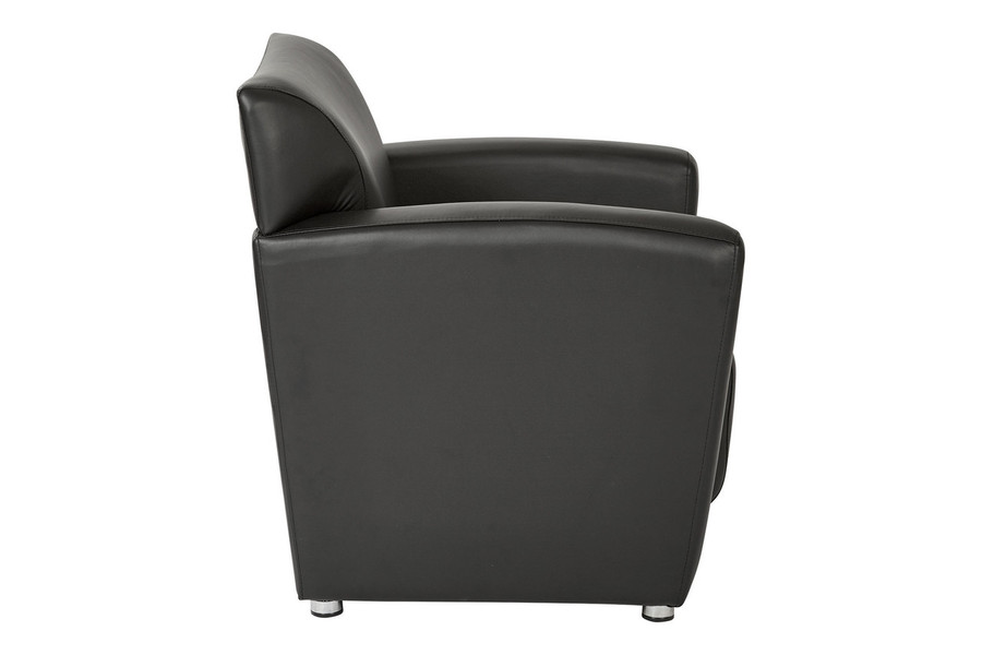 The perfect combination of understated style and a unique silhouette, Office Stars sleek Black Faux Leather Club Chair with Silver Finish Legs sneaks with versatile ease into all manner of modern motifs, even those with a mid-century vibe. Expertly upholstered in elegant easy-care eco-friendly imitation leather, the Black Faux Leather Club Chair with Silver Finish Legs by Office Star is an effortless accent just about anywhere, and is equally ideal arranged in a set of two or accompanying Office Stars similarly designed pieces.