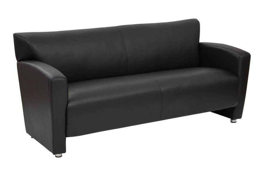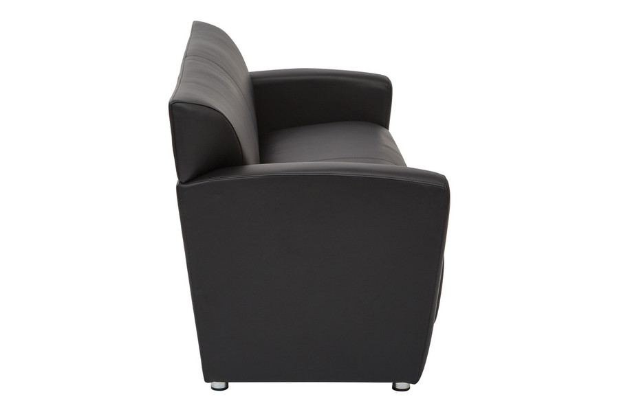 Stretching style into a full-length silhouette, Office Stars Black Faux Leather Sofa with Silver Finish Legs sneaks with versatile ease into all kinds of contemporary areas, even those with a mid-century vibe. Understated yet elegant, and even with an element of edginess, the Black Faux Leather Club Sofa with Silver Finish Legs by Office Star is expertly upholstered in easy-care eco-friendly imitation leather for lush, long-wearing style and comfort, whether arranged on its own or accompanying Office Stars similarly designed pieces.
