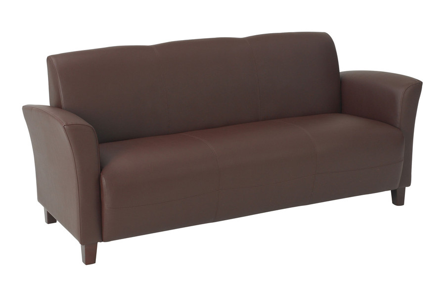 A stunningly, sharp design arrives in the form of the Sofa with Cherry Finish Legs. This seating option boasts a clean and contemporary look, while blending both current and classic influences for a unique appearance that fits wherever it is used. Featuring high-quality, bonded leather upholstery with plush, cushioned seats for optimal comfort, this sofa is sure to modernize any interior space. These features are combined with durable metal and wood construction as well as GreenGuard Certification, making for a beautiful and environmentally friendly sofa that reflects your unique, individual style.